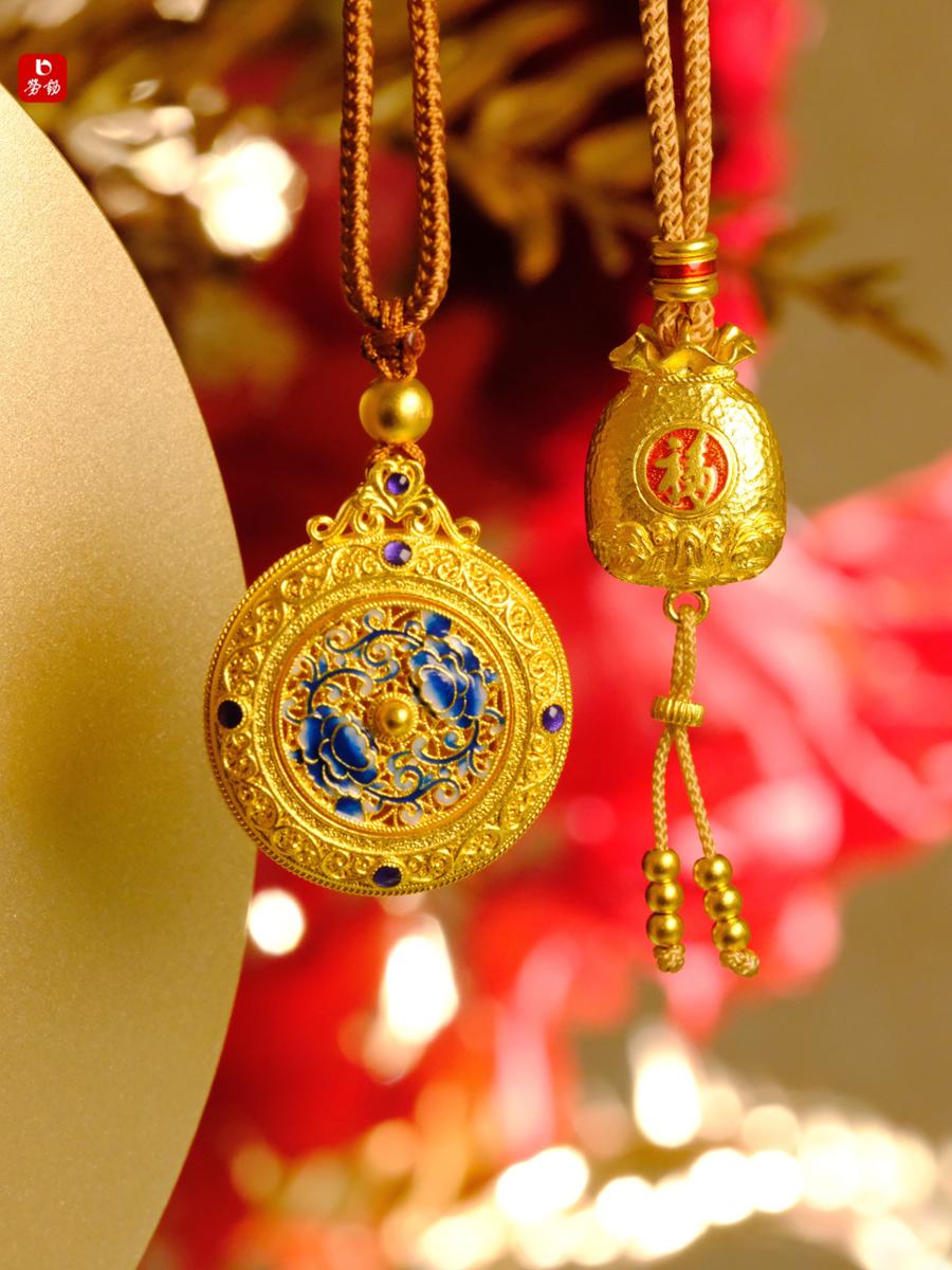 老凤祥珐琅工艺的中式宫廷珠宝挂件,是传统与现代美的交融。每一件挂件,都凝聚着匠人们无数个日夜的心血。珐琅色彩绚丽,如同一幅幅细腻的工笔画,在金属的衬托下,散发出夺目光芒。那繁复精美的图案,源自古老宫廷的灵感,花卉+缠枝纹寓意花开富贵,纹样古朴华贵,每一处细节都诉说着千年的故事,让人一眼万年 ,仿佛穿越时空,梦回紫禁城,感受那份独属于东方的典雅与尊贵。