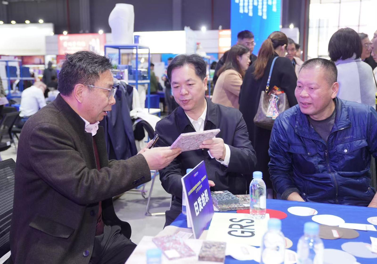 废旧纺织品经过回收及一系列加工,变成有着独特色彩和艺术纹理的纤塑复合环保材料。在福建永安市日发纺织有限公司的展位上,多家企业早早前来洽谈。企业相关负责人郭永进介绍,多年来,企业在纺织品回收再生面料方面闯出一条创新路。几年前与华东理工大学教授吴驰飞展开合作,他专注于废纺循环利用,在其支持下,企业纤塑复合材料的技术和设备达到国内先进。“我们通过技术创新,将废纺变成再生涤,很受国外知名客户欢迎,有很好的行业前景。”