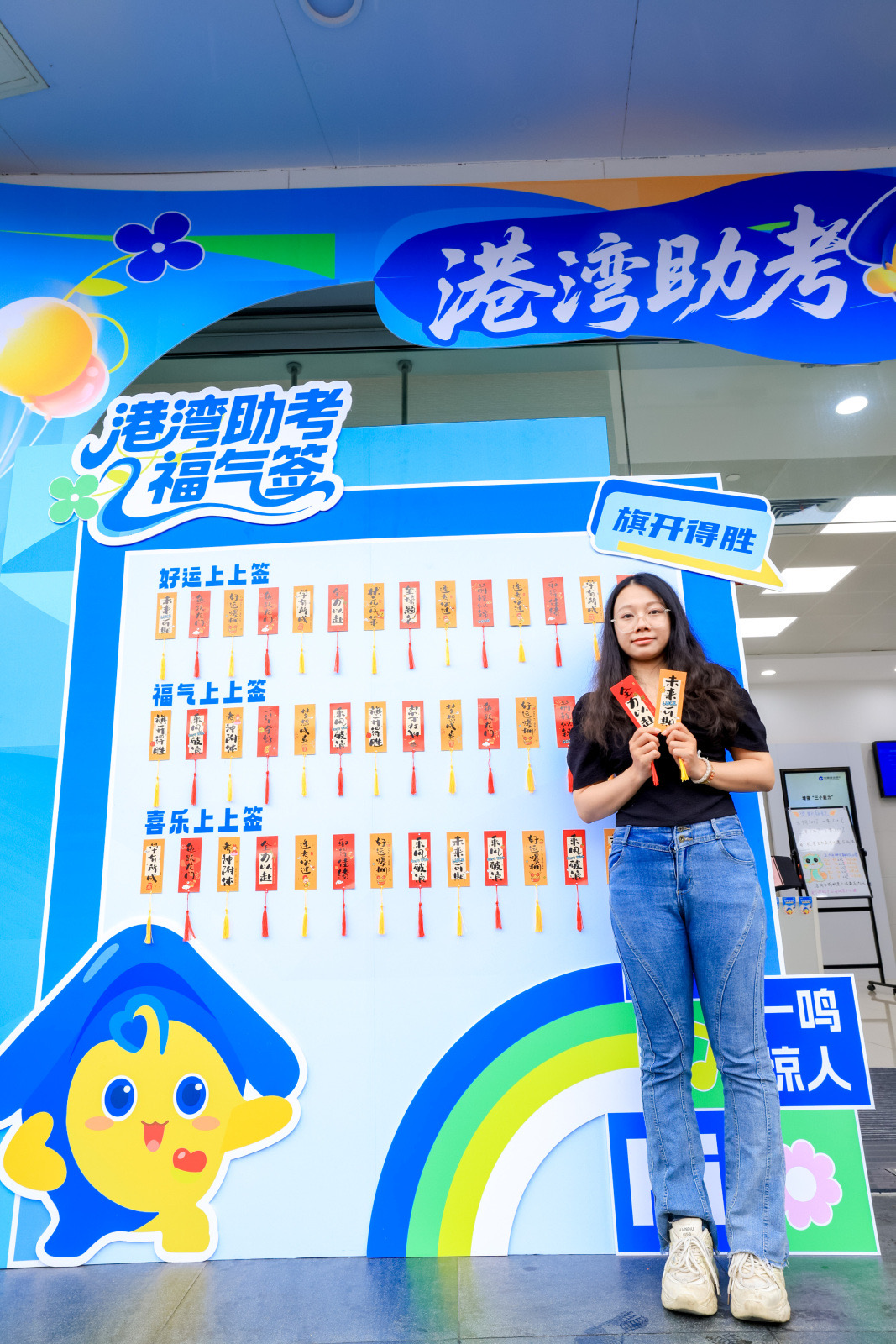 走进建行上海长宁江苏路支行,门口“港湾助考 为梦想而战”的标识牌被雨水冲刷得格外醒目,色彩缤纷的迎宾气球在微风中轻晃,仿佛在为考生加油。网点入口处,劳动者港湾吉祥物“状元湾宝”憨态可掬地招手,邀请考生和家长入内避雨。尽管“港湾助考福气签”被雨水打湿了边角,但“旗开得胜”的祝福依旧清晰。原本的等候区已布置成“助考专区”,“港湾语录墙”上“笔下生花 未来可期”等手写祝福,满是建行人的巧思。