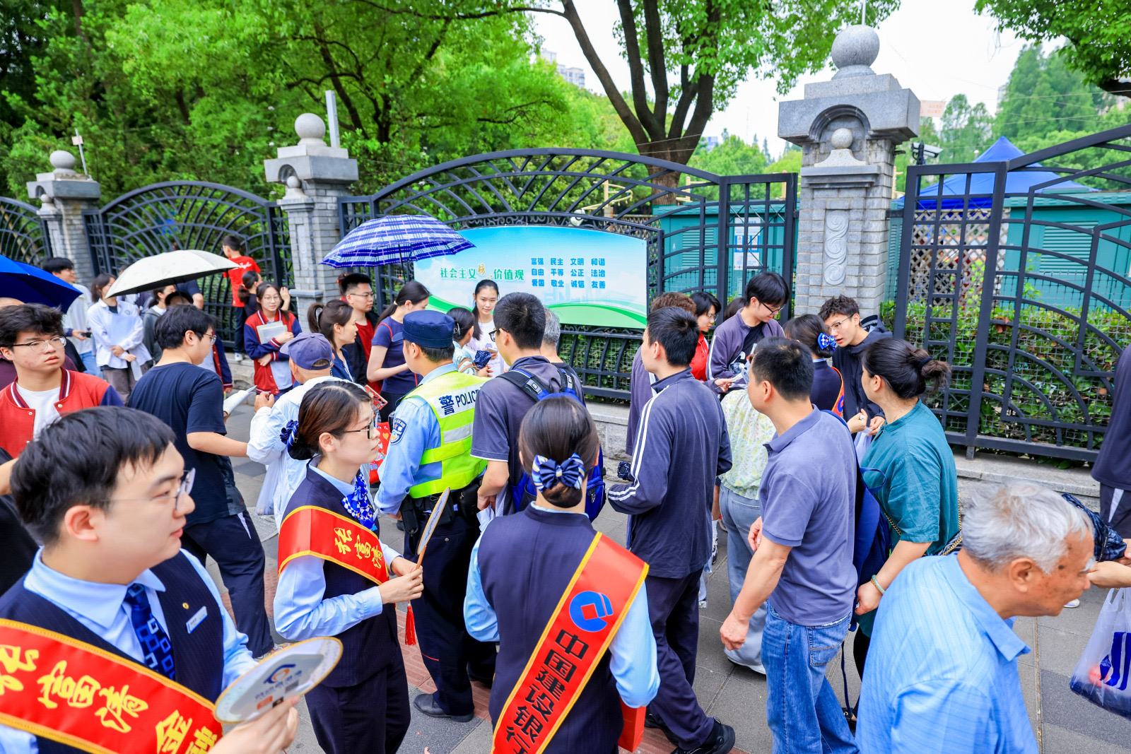 在上海市第三女子中学考点外,张富清金融服务队的“助考能量驿站”在雨中忙碌不停。时阴时晴的天气为赴考路添了波折,但队员们始终坚守——他们手持爱心雨伞,为考生加油打气,护送其步入考场。一位交警感叹:“每年高考都能看到建行,今年下雨,他们的服务更是帮了大忙。”