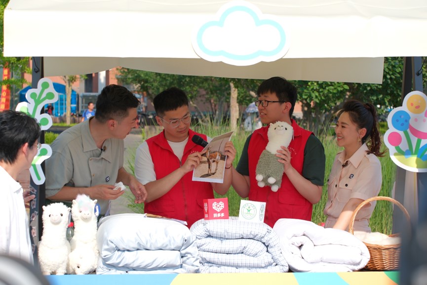 北京延庆羊驼科技小院的同学们带着羊驼绒被、羊驼文创参加毕业市集。王心悦|摄