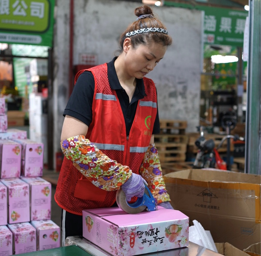 ▲上海农产品批发市场内,员工们正打包着当日鲜果。周良波|摄