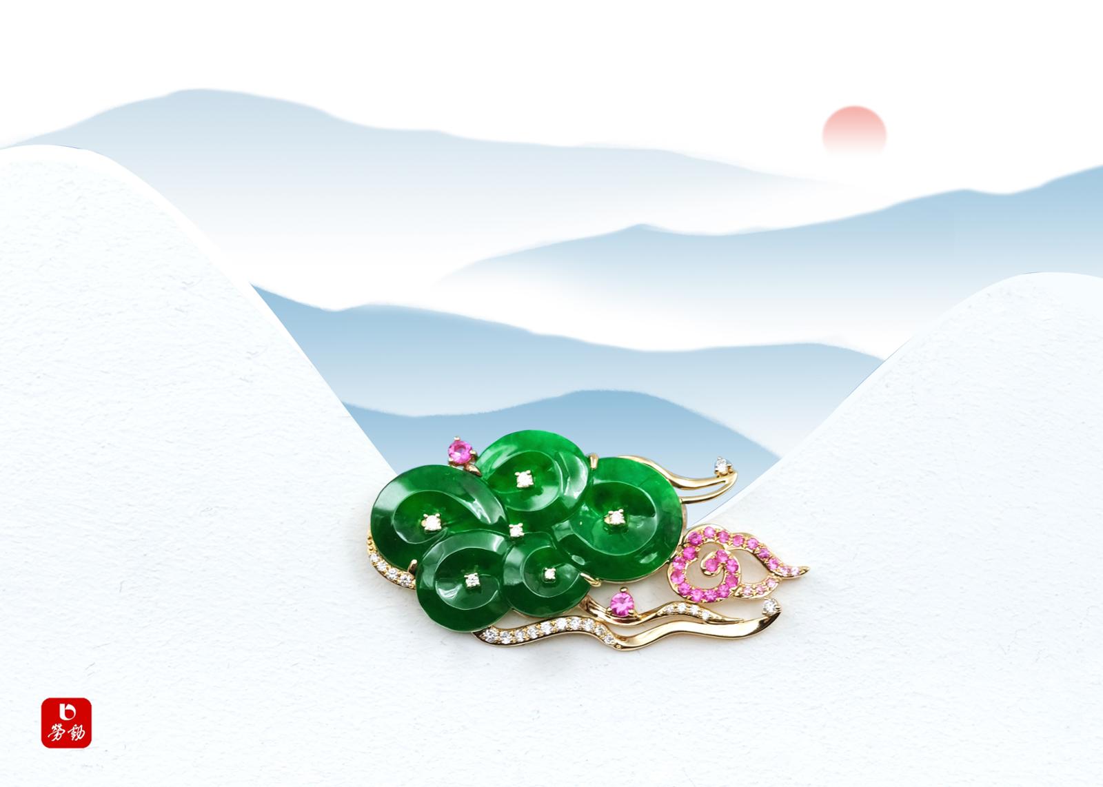 第三款胸针,主体是那几颗圆润饱满的翡翠圆环,似夜空中的明月,莹润的光泽仿佛蕴含着月华的清辉。金色流云造型及其上的钻石、粉色宝石轻盈灵动,增添了一抹温柔的色彩。当你将它别在衣襟,那翡翠圆环便如明月高悬,金色流云与宝石似彩云萦绕,仿佛将宋代词人笔下“彩云追月,不负韶华”的意境定格于此。举手投足间,它随着你的动作轻轻摇曳,流云与宝石相互映衬,似彩云在追逐着那轮皎洁的明月,演绎着一场跨越千年的浪漫邂逅。