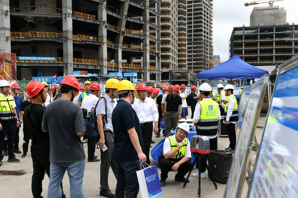 项目部结合目前实际工况,对智能建造设备与绿色低碳技术两大板块进行了现场展示。无人塔吊的安全、智能、高效驾驶。智能顶升钢平台,为塔楼核心筒施工提供多个可同时作业的作业面,极大提升工人作业安全性及舒适性。还展示了智能抹灰机器人、混凝土整平机器人、管道巡检机器人等一系列高科技智能建造装备。还重点展出再生资源处置属于绿色低碳技术应用,为毛垃圾分选、毛垃圾破碎、骨料筛分、肥槽回填、余料外运、二次再生,为绿色低碳技术提供强有力的示范。