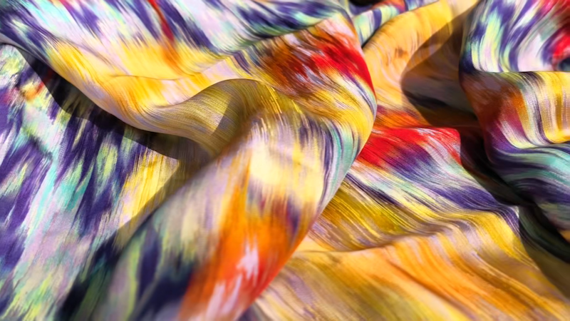 作为新疆维吾尔自治区和田“三宝”之一,艾德莱斯的织染技艺延续千余年。展开一匹新织的艾德莱斯丝绸,仿佛打开了大地的调色盘:帕米尔高原的初雪白、和田玉龙喀什河的浅葱青、塔克拉玛干落日的橙红……虚实相间、如光影般流动的色晕效果,让丝绸成为凝固的四季。