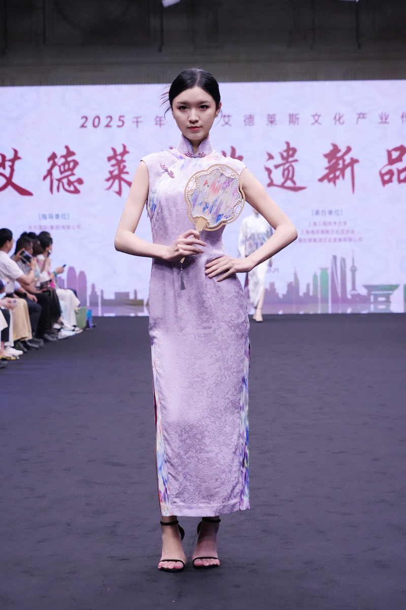 两周后,在金色胡杨环绕的叶尔羌河畔,一件件艾德莱斯新品在第六届新疆喀什丝路文化胡杨节暨莎车县“昆仑乐都·木卡姆艺术季”秀场上再次登场。海派旗袍的典雅剪裁与艾德莱斯的绚烂纹样相映生辉,将非遗时尚从黄浦江畔带回了丝路源头,形成了沪喀两地深情的文化呼应。