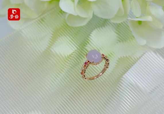 淡粉紫翡翠像春日晨雾,糯润通透,带着朦胧的温柔感。玫瑰金戒托缠绕细碎红宝与碎钻,像藤蔓攀着繁花,灵动又显白。上手就是温婉大小姐,配旗袍、针织衫都绝了,温柔到骨子里。