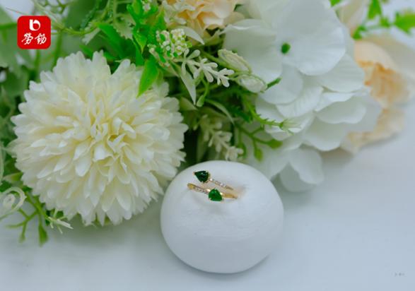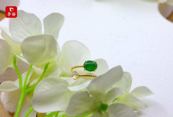 两颗梨形绿翡像刚舒展的春叶,对称镶嵌在金戒上,碎钻点缀其间。纤细戒圈衬得手指修长,清新又灵动,像把春日的微风与绿意都握在手心。日常戴不挑风格,素颜也能hold住,元气感直接拉满。