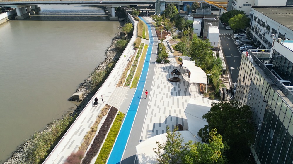 漫步蕰藻浜滨水步道、高密度的公园绿地,“3分钟进公园、5分钟亲水岸”的轻松慢行,成为喧嚣都市里的难得体验。