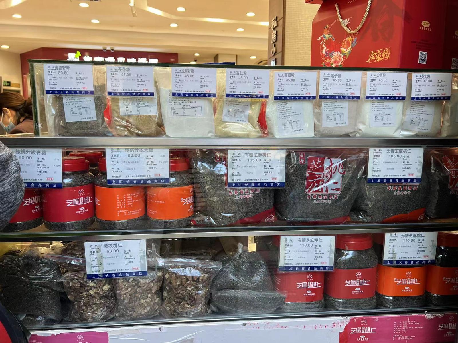 上海卖芝麻核桃粉的商店很多,同样在淮海中路上,几百米外的第二食品商店的现磨柜台,也在上演火热排队的场景。这里的核桃同样产自云南,芝麻则产自安徽,按需称重后现磨,也是芝麻核桃近1:1的配比,芝麻都是一样的,但可以选择不同品质的核桃,价格会有差异。