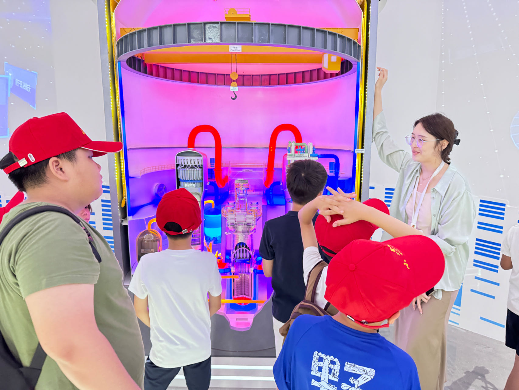 昨天的活动中,最亮眼的明星是30比1的“国和一号”模型,“小记者”们环绕着核工院的科普志愿者,纷纷好奇地打量一人多高的模型。科普志愿者深入浅出地做着介绍,“国和一号”上端是一个装着3000多吨冷却水的超大水箱,蕴含着关键的核安全设计理念——非能动技术保障,不依赖外在动力源即可通过自身重力和自然循环运行……“小记者”们认真倾听,不时低头在采访本上记录,在科普志愿者的讲解下,一步步了解着核电站工作原理。