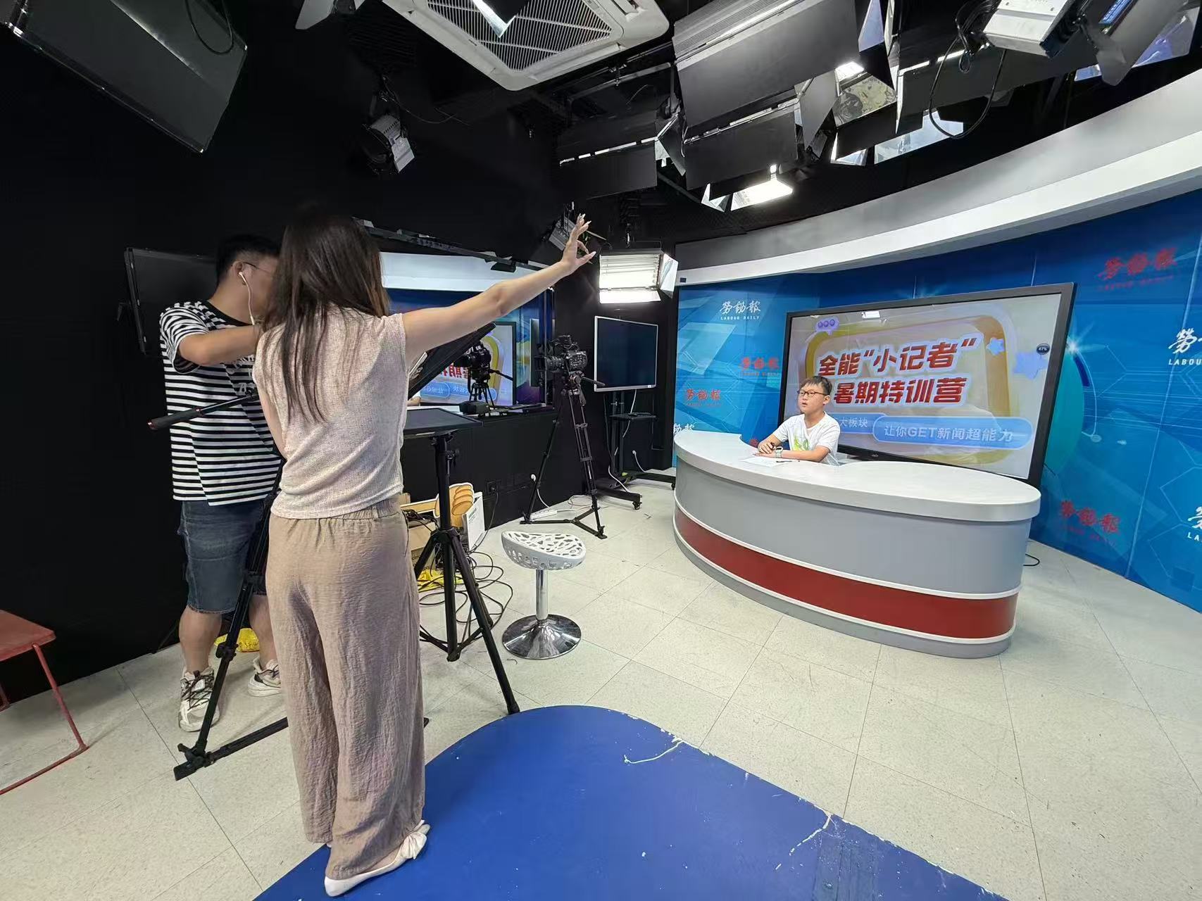 举起话筒,当起栏目“主编”,对报纸上的稿件一番品评;端起相机、手机,化身新闻“记者”,将精彩瞬间进行独家记录;走进演播室,成为出镜“主播”,对着摄像机和提词器流畅播报……带着获得“提笔能写、举机能拍、对镜能讲”新闻“超能力”的期待,20余位同学来到劳动报社举办的“全能小记者暑期特训营”,在为期5天的时间里,全方位、沉浸式、系统地了解新闻采写和新媒体相关知识,在实地采访和实践互动中,练习新闻写作、播音以及图像拍摄、AI制作等技能。