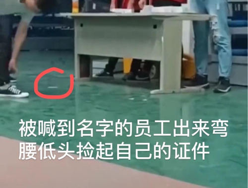 视频内容显示,三个男子站在一个桌子前面,两个男子身穿红色马甲,一男子身穿白色短袖露出肚脐,靠当中一男子手持话筒念着员工名字,念到一个名字,就向地上扔一个员工证件。很多人弯腰捡起地上的证件,可以看到,一人弯腰从地上捡起自己证件的同时,另一人的证件从他眼前飞过。