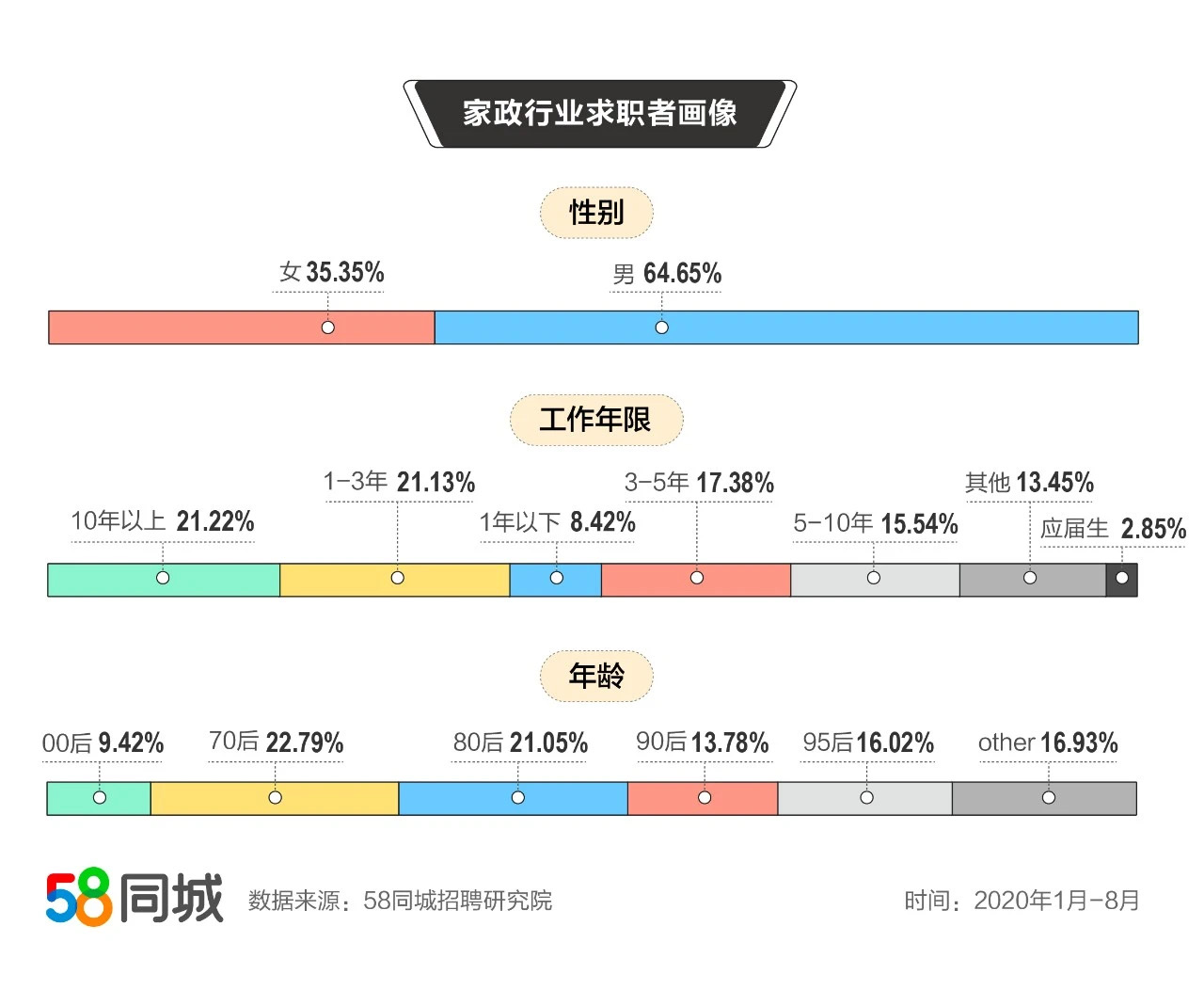 9月18日,58同城发布家政行业求职大数据,今年1至8月,家政行业90后求职者占比13.78%,80后求职者超过21%,10年以上工作者超20%;家电维修工作吸引了更多男性求职者,女性从事育婴师、月嫂工作意愿高。