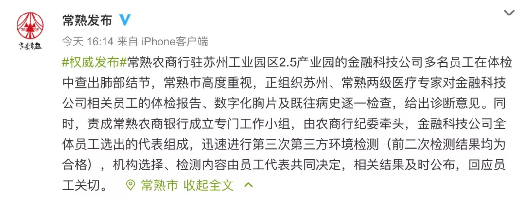 针对网上热议的常熟银行群体性肺结节事件,江苏省常熟市委外宣办、常熟市政府新闻办官方微博回应称:常熟农商行驻苏州工业园区2.5产业园的金融科技公司,多名员工在体检中查出肺部结节,常熟市高度重视,正组织苏州、常熟两级医疗专家对金融科技公司相关员工的体检报告、数字化胸片及既往病史逐一检查,给出诊断意见。