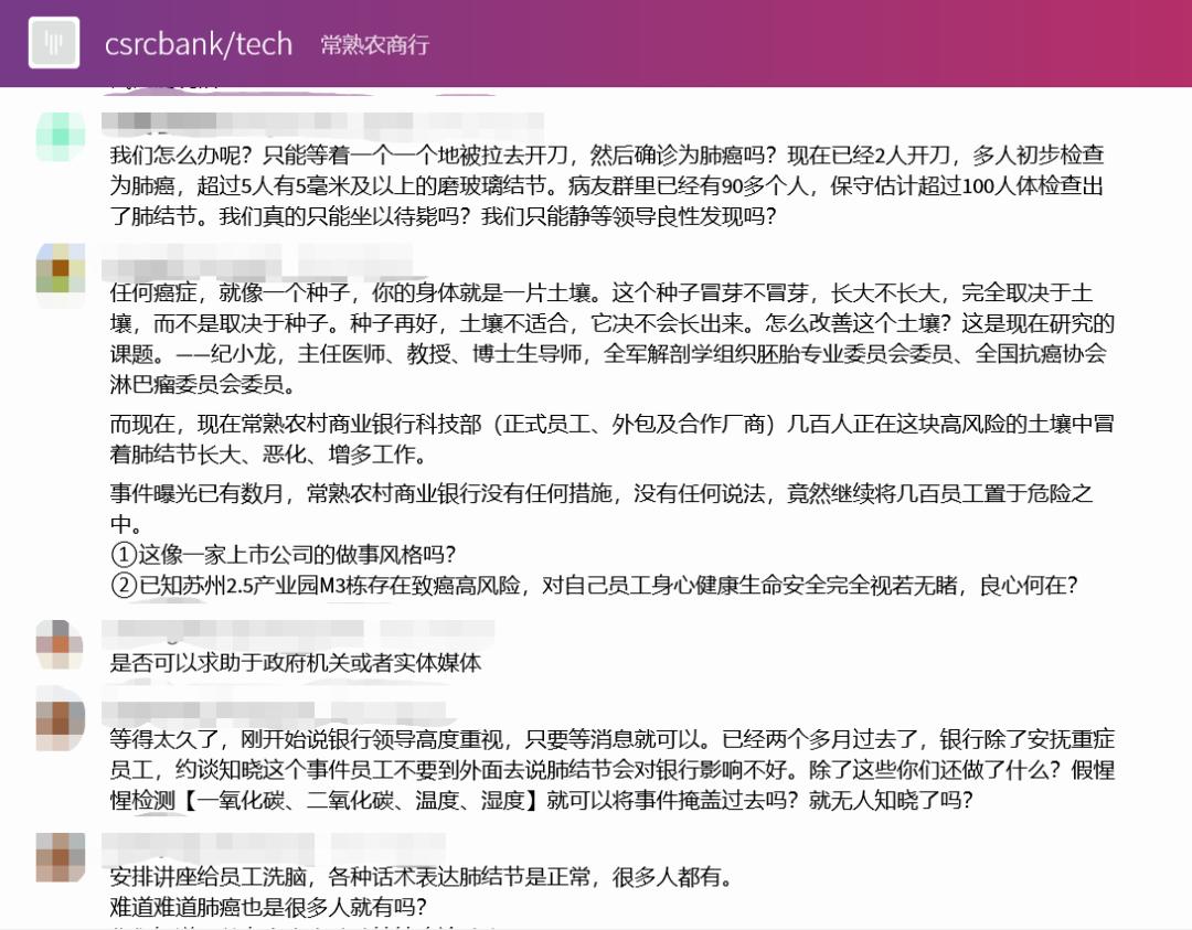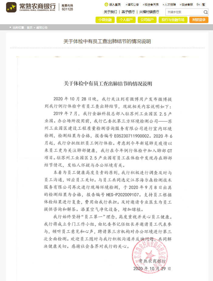 位于苏州2.5产业园的常熟农商银行金融科技总部组织员工体检,大量员工发现有肺部结节。十余位员工在某公开论坛中发帖,称自己在肺部发现结节,多名员工的肺结节大小接近8mm,已有2名员工进行手术,怀疑与办公环境有关。