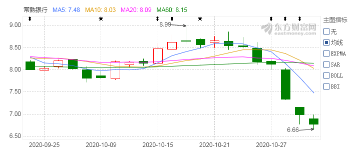 从10月22日至今,常熟农商银行的股价已经连跌7天了。其中,10月22日的最高价为8.86元/股,10月30日的最低价为6.66元/股,已下跌约24%,市值蒸发了约60亿元。