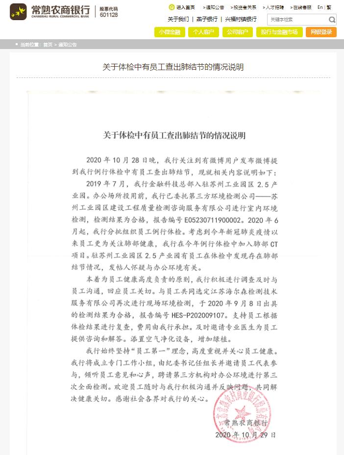 在官方回应之前,常熟银行业也曾两次对此事进行回应。10月29日,常熟农商银行在官网回应称:2019年7月,其金融科技总部入驻苏州工业园区2.5产业园。在办公室投入使用前,就曾委托第三方进行室内环境检测,检测结果为合格。此后由于仍有员工怀疑,公司和员工又选定一家公司再次检测现场环境,9月8日出具的检测结果仍为合格。