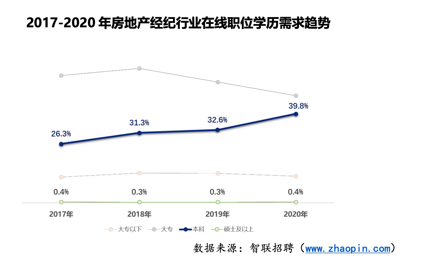 智联招聘近期发布的一份报告显示,2017-2020 年,房地产经纪行业本科及以上人才需求占比由26.7%上涨到40.2%,房地产经纪行业整体人才质量提升需求迫切。