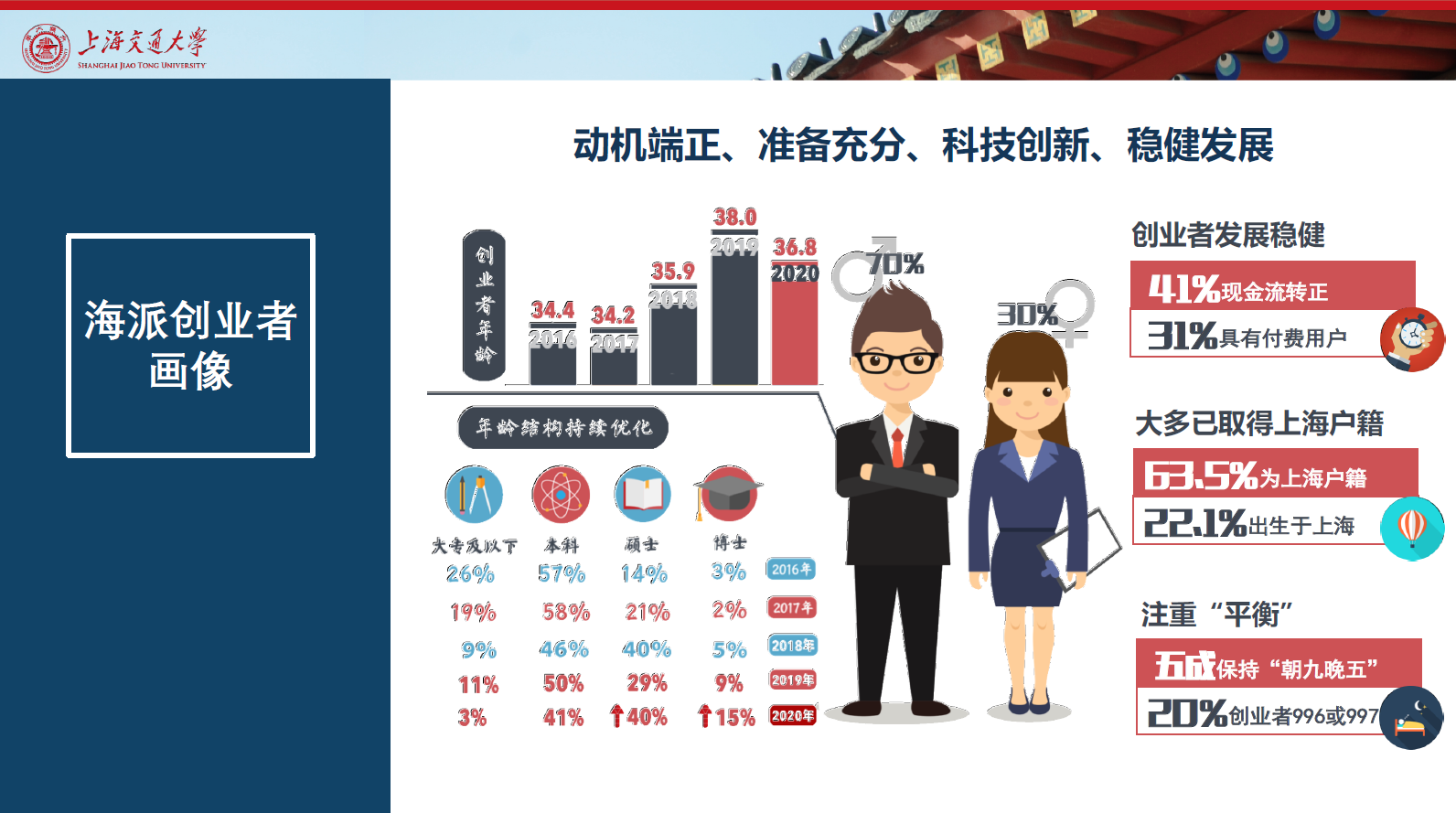 过去五年,海派创业者形象基本形成。桑大伟向记者分享了一组报告中的数据。上海创业者的年龄、性别、学历、职业经历、工作节奏、行业特点等基本特征显著而稳定。