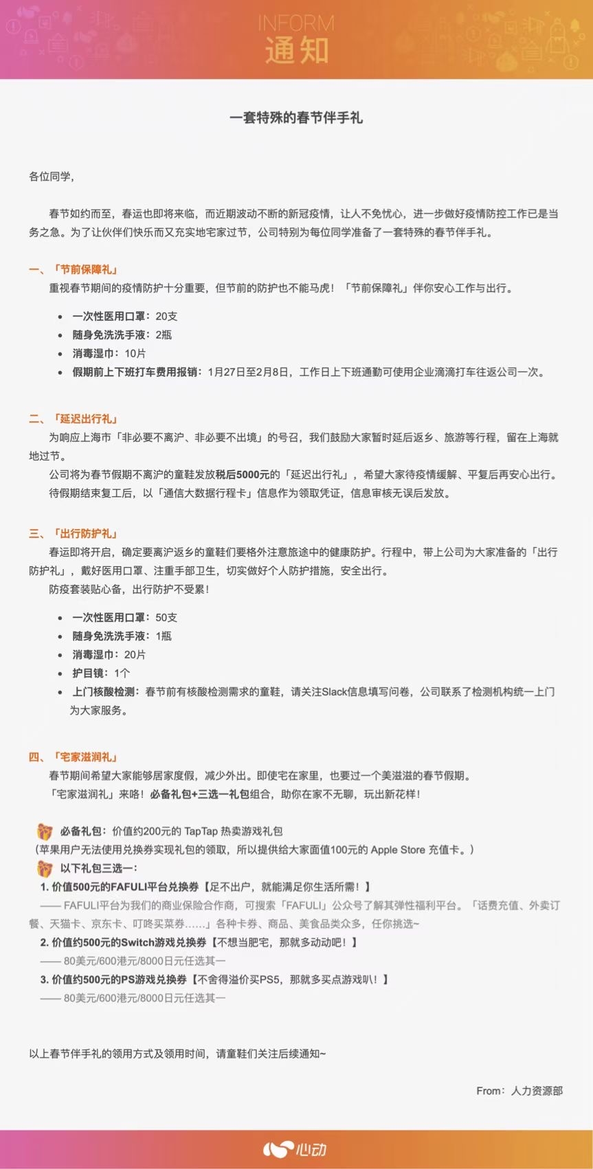 心动网络为员工准备了四份礼品:春节假期不离沪的员工可以在复工后领取税后5000元的“延迟出行礼”,确定要离沪返乡的员工则会得到医用口罩、洗手液等出行礼包,在春节前还将得到上门核酸检测的服务。同时,为了鼓励员工居家度假、减少出行,心动员工在春节期间将获得一定价值的游戏礼包或游戏充值卡。