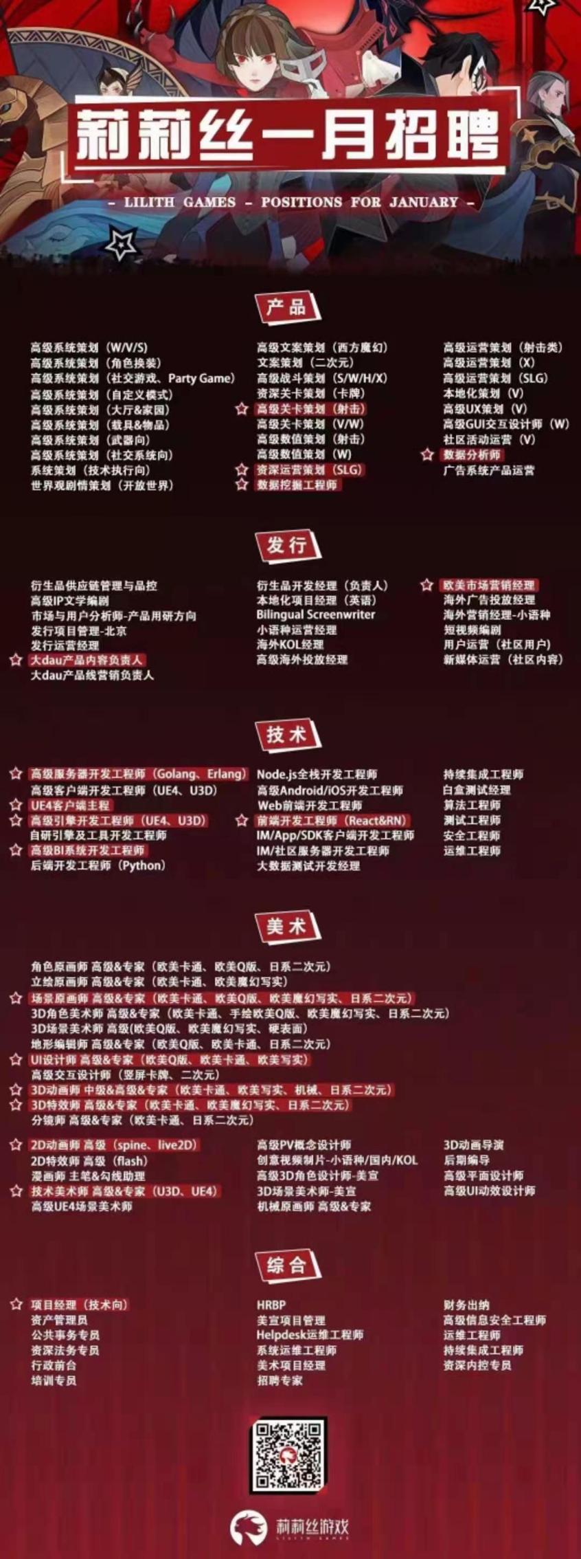 在发布“留沪礼包”“延迟出行礼”的同时,上海的多家头部游戏企业还同时发布了招聘公告。以莉莉丝为例,他们发布的招聘公告涵盖产品、发行、技术、美术、综合五个门类共计超过100个,依然处于人才缺口较大的状态。