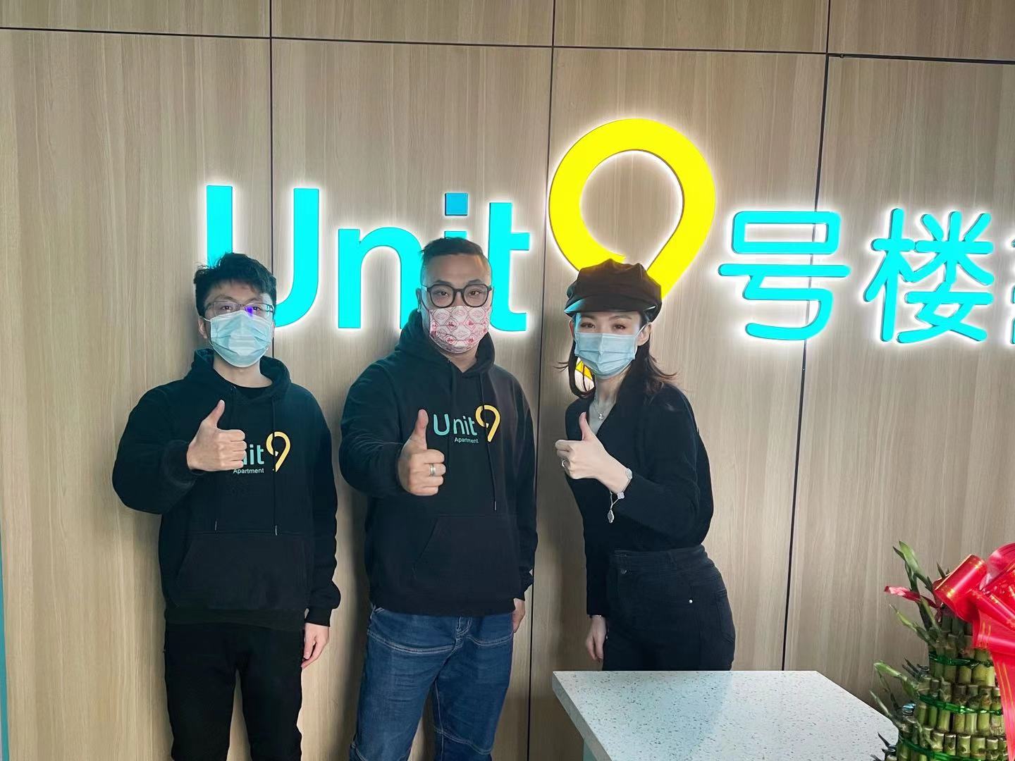 记者与魔方9号楼公寓留沪工作人员合照(左一:梁策)