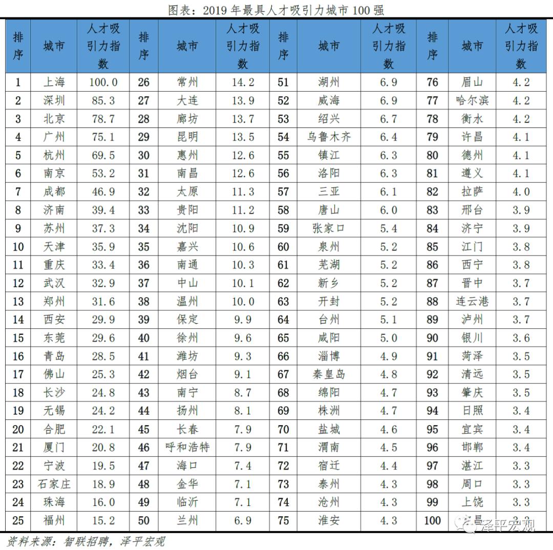 榜单概览:上海连续3年成为最具人才吸引力城市。1)中国最具人才吸引力城市100强:沪深京居前三。为衡量不同城市的人才吸引力,定义人才吸引力指数为人才流入占比、人才净流入占比、应届生人才流入占比、海归人才流入占比的加权结果。其中,人才流入占比和人才净流入占比分别反映该城市引得来和留得住的能力,应届生人才流入占比和海归人才流入占比反映城市对年轻高学历人才和海归高学历人才的吸引力。从结果看,2019年上海、深圳、北京位居前三名,上海自2017年起连续三年第一,广州、杭州、南京、成都、济南、苏州、天津位居前十。2019年应届生和海归人才流向北上深广的比重分别占比24.5%、28.7%,均高于流动人才流向北上广深的比重20.2%,应届生和海归更倾向往一二线城市。2)人才流动趋势:长三角珠三角人才集聚、京津冀人才流出。分地区看,2019年东部、中部、西部、东北人才净流入占比分别为5.8%、-2.4%、-0.2%、-3.2%,东部人才持续集聚,中西部持续流出但有所收窄,东北持续流出且幅度扩大。分线城市看,2019年一线、二线、三线、四线人才净流入占比分别为-2.7%、1.1%、1.8%、-0.3%,2018年分别为-0.9%、4.9%、-0.3%、-2.3%;结合近4年数据观察,一线因京沪控人持续流出,二线人才持续集聚,三线较为平衡,四线持续流出。分城市群看,超6成人才流向五大城市群,2019年长三角、珠三角、京津冀、成渝、长江中游城市群人才流入占比分别为23%、14%、13%、7%、7%,净流入占比分别为5.0%、2.8%、-4.0%、0.0%、-0.5%,长三角、珠三角人才集聚,京津冀受北京控人影响人才净流出,成渝和长江中游基本平衡。