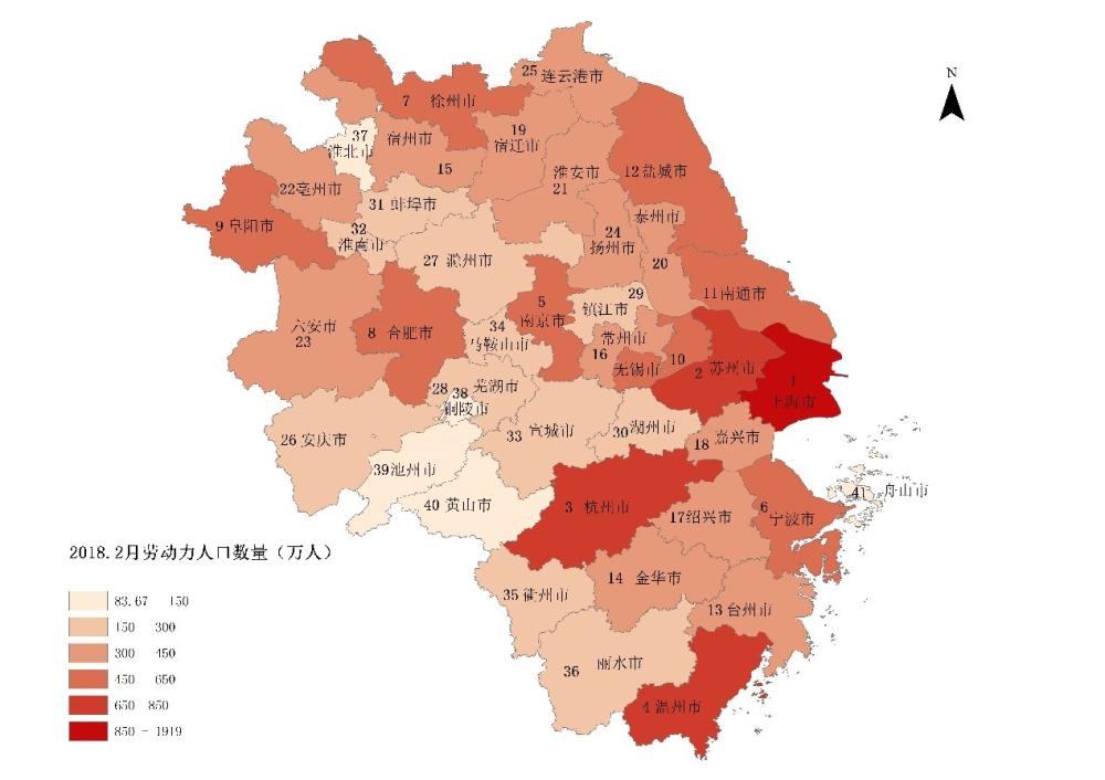 图 2 长三角41城劳动力人口数量及排序(2018年2月底)
