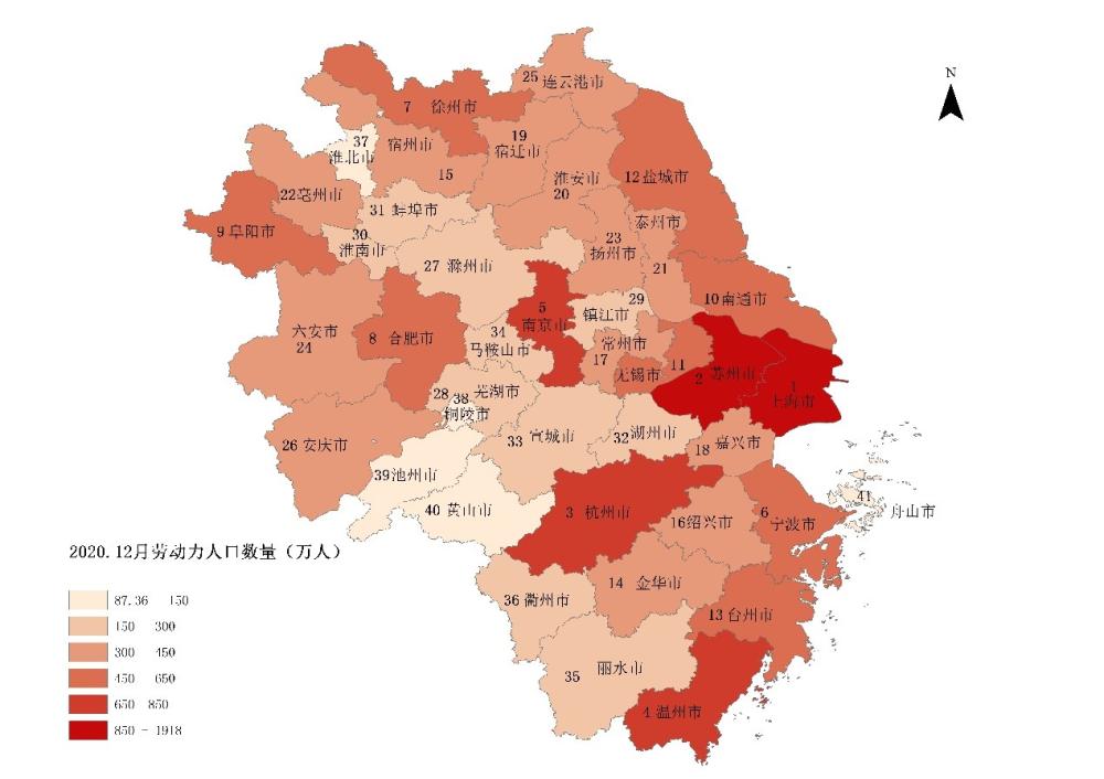 期初排名最高的上海(1919.03万人)大约是排名最低的舟山(83.67万人)的22倍。期末排名最高的上海(1918.44万人)是排名最低的舟山(87.36万人)的21.96倍。差距略有缩小。41城以劳动力人口为变量计算的基尼系数,期初值为0.3400,期末值为0.3394,也说明长三角各城市劳动力人口分布有走向平衡的微弱趋势。