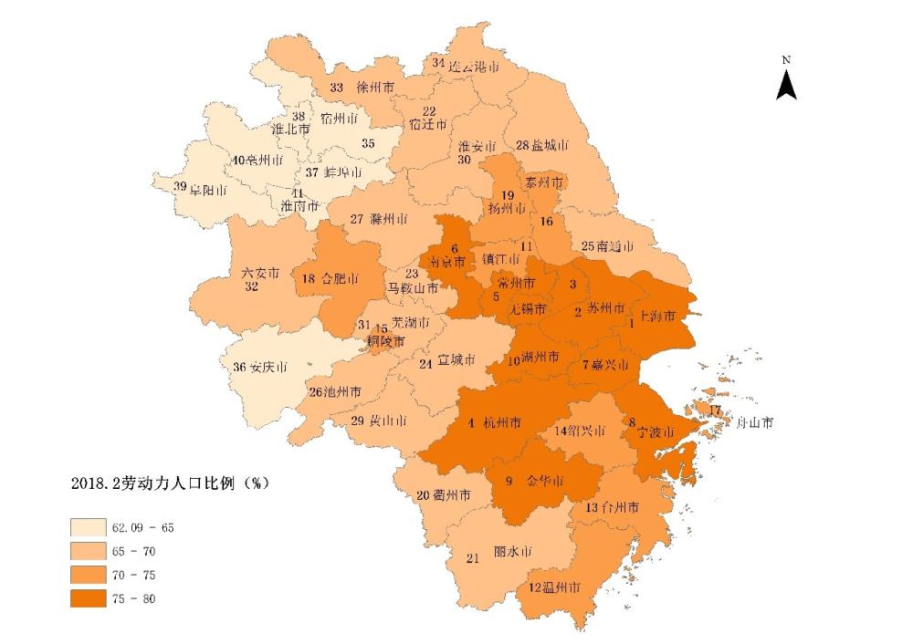图 4 长三角41城劳动力人口比例及排序(2018年2月底)