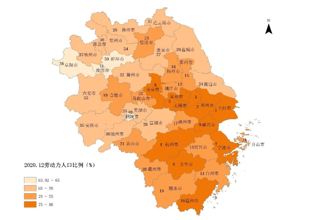 图 5 长三角41城劳动力人口比例及排序(2020年12月底)