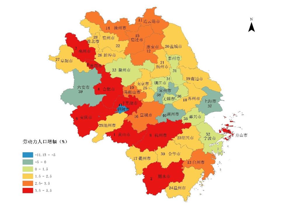 24个中小城市也出现明显分化。一方面黄山、丽水和亳州等劳动力人口增幅均超过5%,另一方面铜陵则锐减11.13%,是一个巨大的反差,背后的原因和影响等,都值得进一步研究。