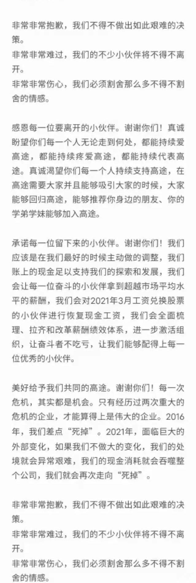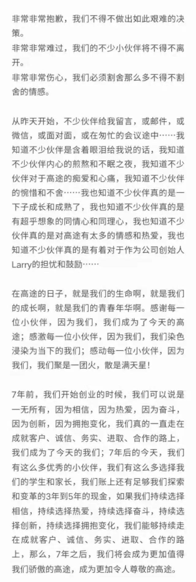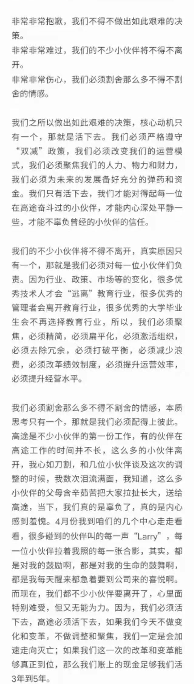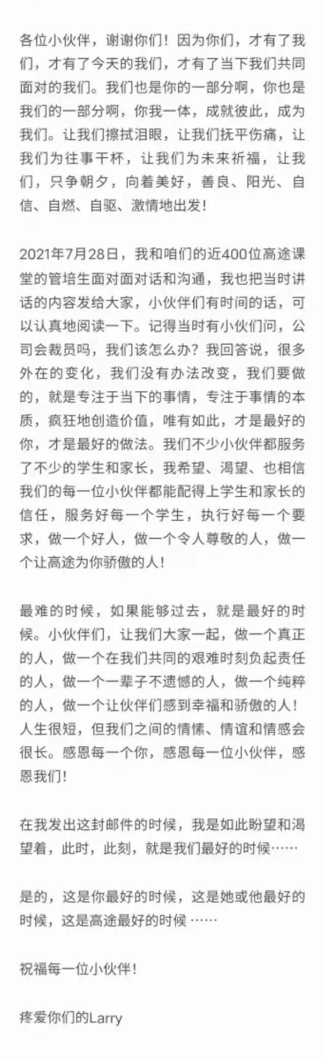 裁员足见人品,高途的全员信中有期许,有真诚,有希望,有现实的保障和利益。足以让其他公司效仿,让我们静待高途东山再起。