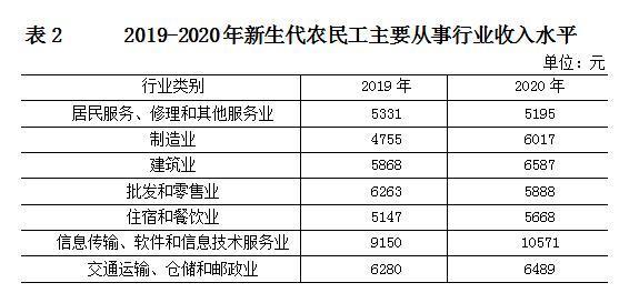 新生代农民工从业人数最多的七个行业按照收入水平排序依次为:信息传输、软件和信息技术服务业,建筑业,交通运输、 仓储和邮政业,制造业,批发零售业,住宿和餐饮业,居民服务、修理和其他服务业。月均收入分别为10571元、6587元、6489元、6017元、5888元、5668元和5195元。其中,收入最高的信息传输、软件和信息技术服务业从业人员月均收入比上年同期增长15.5%;从业人数最多、收入最低的居民服务、修理和其他服务业从业人员月均收入比上年同期降低2.6%。