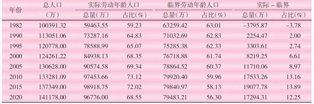 对比人口普查数据和人口机会窗口临界劳动年龄人口比重可以发现:(1)1990年人口普查证实中国人口机会窗口开启。与临界劳动年龄人口比重对照,1982年劳动年龄人口比重为59.23%,明显低于相同平均预期寿命条件下临界劳动年龄人口比重(63.01%)。1990年人口普查劳动年龄人口比重为64.83%,比相同平均预期寿命条件下所对应的临界劳动年龄人口比重(62.83%)高2个百分点。(2)1990~2015年人口机会窗口不断扩大。2015年实际劳动年龄人口比重与临界劳动年龄人口比重之间的差距达到最大,对应的劳动年龄人口规模差距达到19 077.78万人,相当于在现有人口状态条件下,与静止人口相比,有“额外”的19 077.78万人可以参与就业。(3)2015~2020年人口机会窗口开始缩小。从劳动年龄人口规模看,2020年15~64岁劳动年龄人口规模为96 776.00万人,比2015年16~64岁人口98 918.75万人减少2 142.75万人,占总人口的比重由2015年的72.02%下降到2020年的68.55%,减少3.47个百分点。尽管人口机会窗口缩小,但2020年劳动年龄人口比重仍高于临界劳动年龄人口比重10~12个百分点,且远高于1990~2005年的水平。