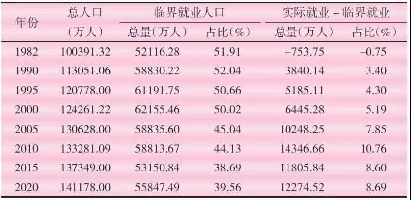 人口机会窗口只有充分就业才能发挥作用。根据1982年以来人口普查和1%人口抽样调查结果,从实际就业状况与对应静止人口就业规模相比可以看出:(1)1982年以前没有人口红利。1982年就业人口规模比临界就业人口规模(52 116.28万人)低753.75万人,即实际就业规模没有达到人口红利产生的最低水平,其主要原因是劳动年龄人口比重低于临界劳动年龄人口比重。(2)1990年开始,中国人口机会窗口开始转化为人口红利。在1990年年龄别就业条件下,1990年16~64岁临界就业人口规模为58 830.22万人,占假定静止人口总量的52.04%。实际就业人口规模比临界就业人口规模“额外”多3 840.14万人,占总人口的比重比临界就业人口比重高3.40个百分点。(3)从1990年开始,中国人口红利持续增加,2010年达到最大。2010年16~64岁临界就业人口规模为58 813.67万人。实际就业人口规模比临界就业人口规模“额外”多14 346.66万人,占总人口的比重比临界就业人口比重高10.76个百分点。(4)2010~2015年中国人口红利开始减少。2015年16~64岁临界就业规模为53 150.84万人,实际就业人口规模比临界就业人口“额外”多11 805.84万人。2015年与2010年相比人口红利“额外”就业人口规模明显下降,2015年比2010年“额外”就业人口减少2 540.82万人。(5)如果保持2015年的就业水平,那么,2020年16~64岁假定静止人口的临界就业规模为55 847.49万人,实际就业人口规模比临界就业人口“额外”多12 274.52万人。根据国家统计局公布的 2020年12月就业困难人员同比增加14.6%的情况,粗略判断受新冠疫情等因素的影响,2020年的实际就业人口规模比临界就业人口“额外”多9 000万人以上的可能性较大。