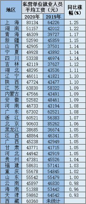 从同比涨幅来看,非私营单位中,宁夏、上海和青海三个地区的就业人员平均工资排前三位,涨幅均超过1.1%;私营单位中,上海、湖南和青海三个地区的就业人员平均工资排前三位,同比涨幅分别为1.25%、1.22%和1.17%。
