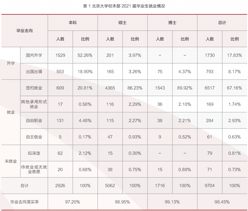 北大2021年全体毕业生(含医学部)合计11985人,全校总体毕业去向落实率为98.29%。北大校本部毕业生合计9704人,校本部毕业去向落实率为 98.45%。在北大校本部毕业生(不含留学生、港澳台学生)中,国内深造比例为17.83%,出国(境)深造比例为8.17%,签约就业比例为67.16%,自由职业和自主创业比例为3.56%。