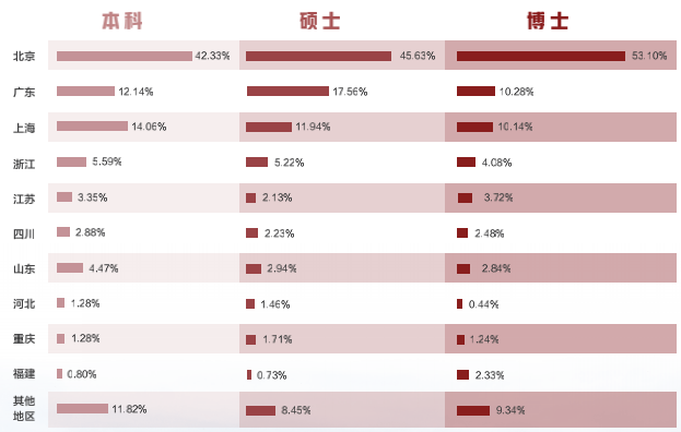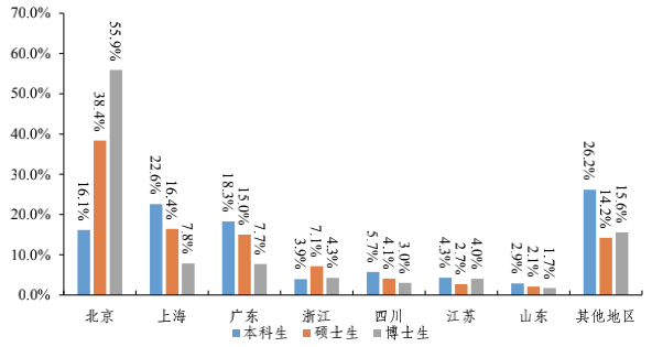 北上广是两校毕业生就业人数居前三位的省(市),两校均有超过半数的博士毕业生留在北京就业。