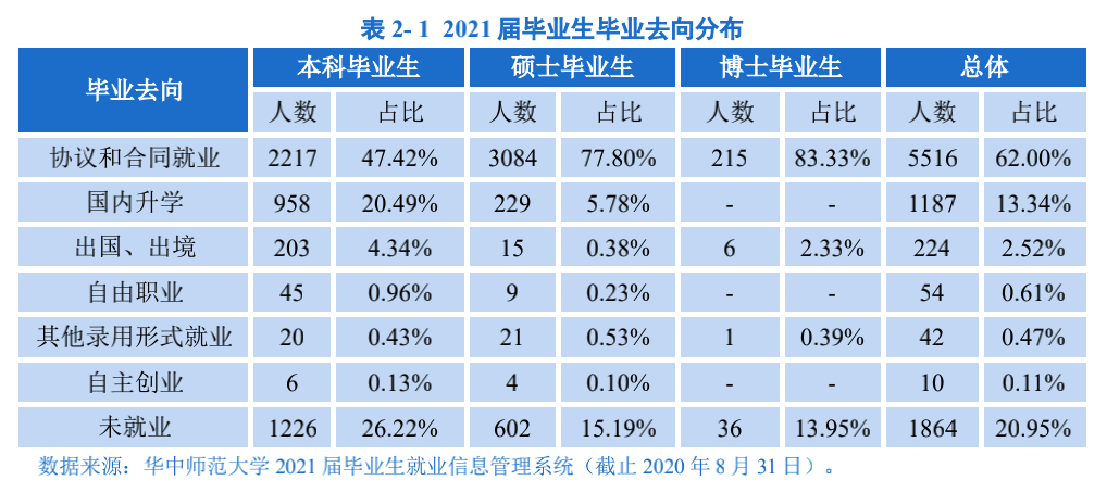 近期,各大高校陆续公布了2021届毕业生就业质量年度报告。其中,华中师范大学公布的毕业生就业率引发热议——本科、硕士、博士毕业生未就业率分别为26.22%、15.19%、13.95%,2021届毕业生未就业人数总体占比20.95%。华中师范大学公布的2021届毕业生就业率。