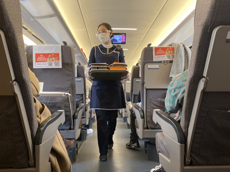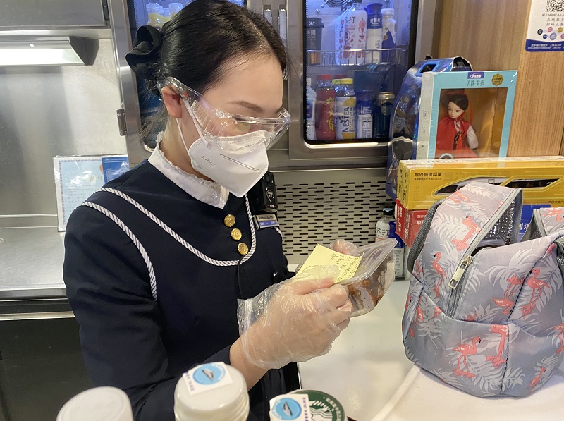 因为中午11时到下午13时是车厢旅客用餐高峰,梁预江只瞥了一眼信息,就又投身到了忙碌的工作中。她迅速端起10份热腾腾的快餐,快步走向车厢,为旅客提供送餐服务。