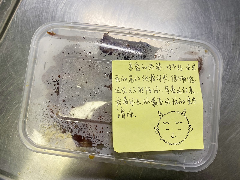 梁预江满怀期待地拉开保温袋拉链,一张贴着便利贴的便当映入眼帘。“亲爱的老婆,对不起,这是我的第52张检讨书了,很惭愧,这次又不能陪你。等春运结束,我带你去你最喜欢玩的室内滑冰。”