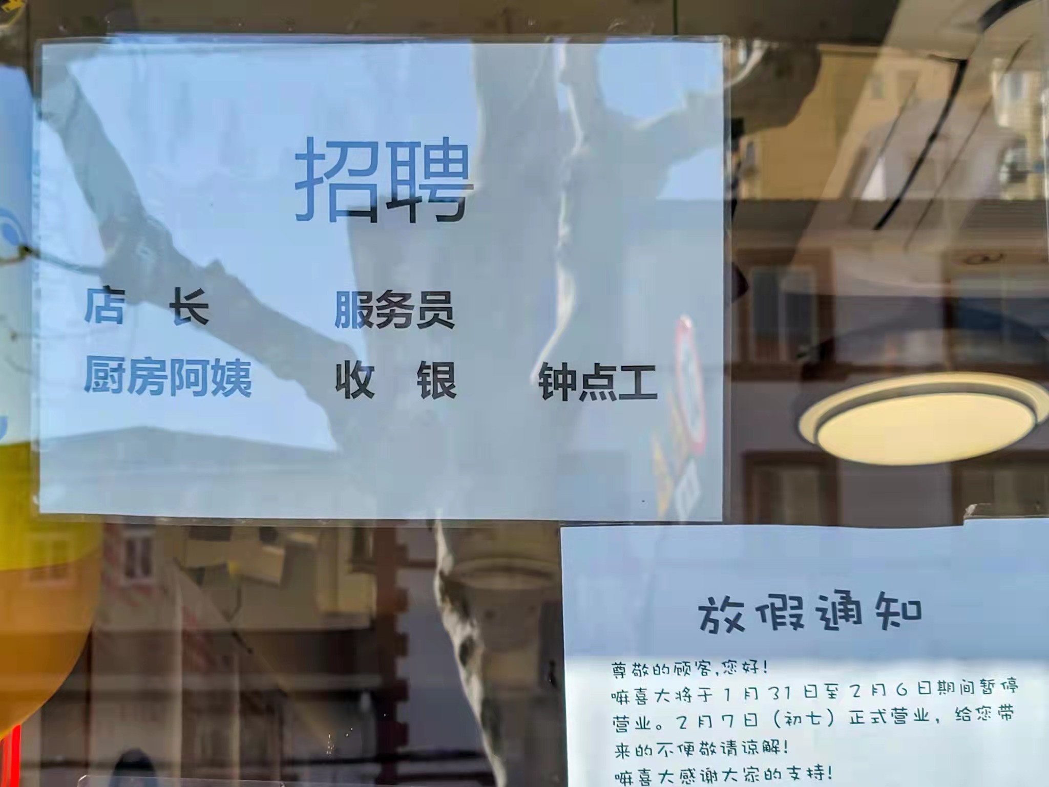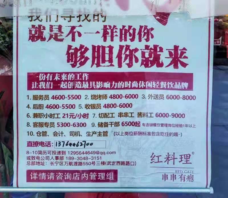“雇年轻女孩是个奢望,我现在是个人愿意来干就行。”在四平路上,一家酸菜鱼餐厅的负责人如此告诉记者,现在自己的要求是“男女不限、年龄不限、经验不限”,“我自己家亲戚全都上岗了,实在忙不过来。”