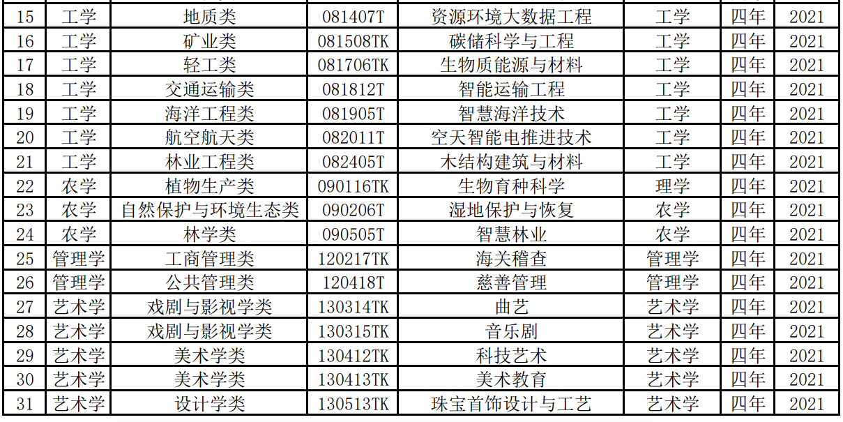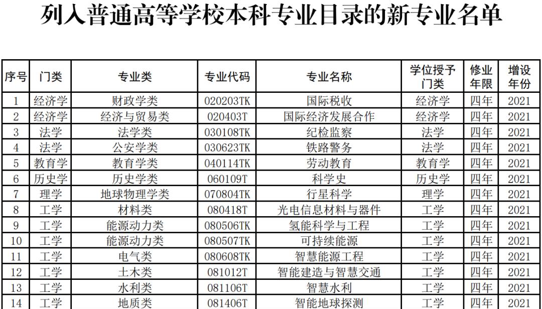 近日,教育部印发《关于公布2021年度普通高等学校本科专业备案和审批结果的通知》,新增1961个专业点、撤销804个专业点。碳储科学与工程、空天智能电推进技术、生物育种科学、资源环境大数据工程、湿地保护与恢复、智慧林业、劳动教育、科学史等31种新专业正式纳入本科专业目录。