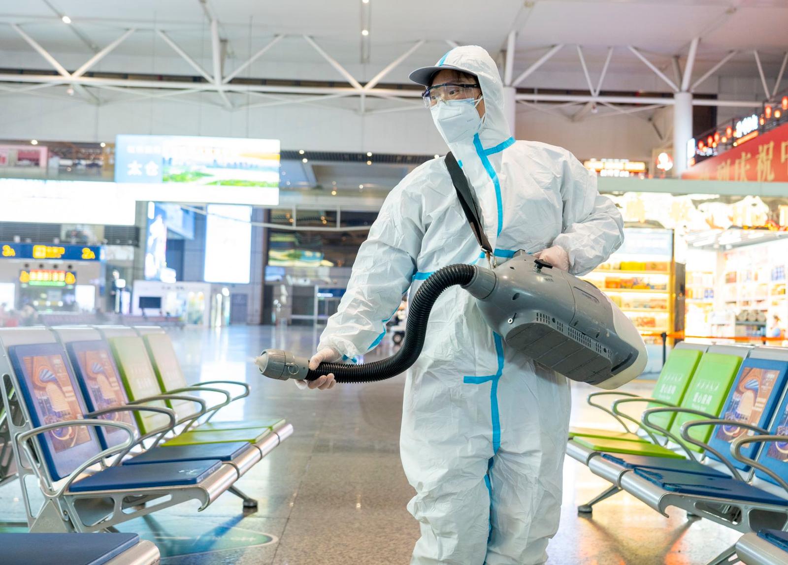 右手握住喷头,左手打开开关,上下左右挥动右臂,按1:1000稀释后的过氧化氢消毒液从喷头中轻柔地喷洒出来,在空中变成云雾散开落下……晚上19时,佩戴防护装备,背着消毒喷雾器的喻昌秀又一次对上海虹桥站公共场所进行喷洒消毒。