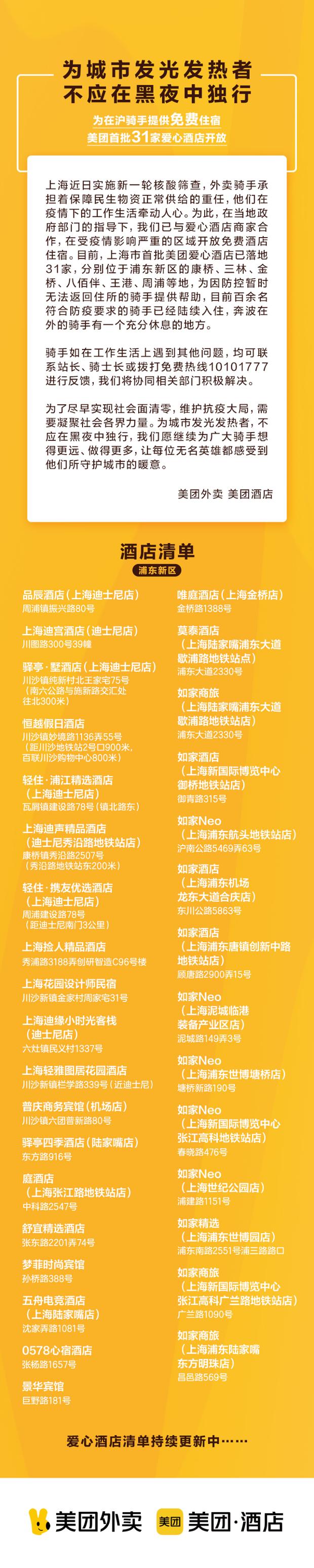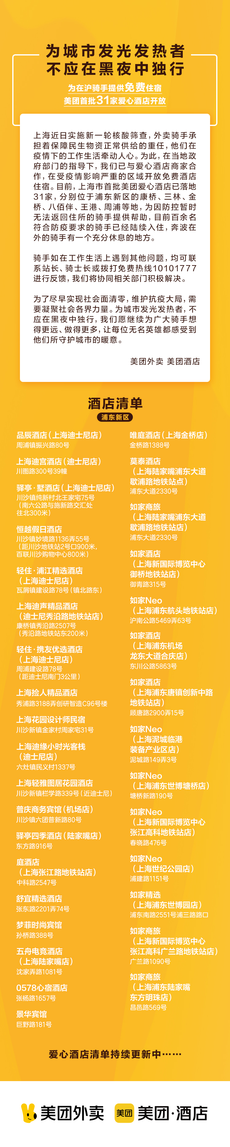上海新一轮切块式、网格化核酸筛查开始后,外卖骑手成为城市保供的重要群体。为做好后勤保障,解决骑手的后顾之忧,在上海市相关政府部门的指导下,美团外卖、美团酒店迅速携手上海多家爱心商家,在受疫情影响严重的区域开放免费酒店住宿,为因为防控暂时无法返回住所的骑手提供帮助。目前,首批31家美团爱心酒店已覆盖上海浦东新区,分别位于康桥、三林、金桥、八佰伴、王港、周浦等地。