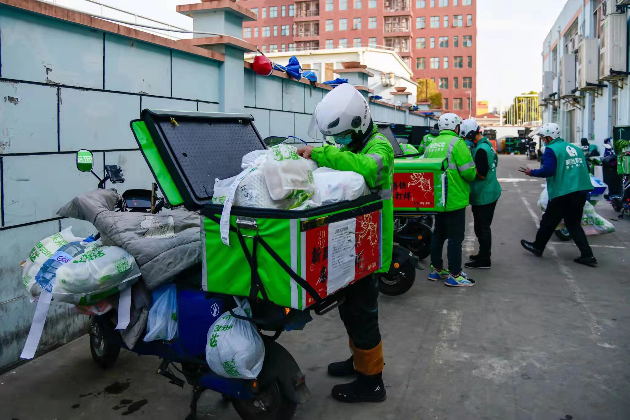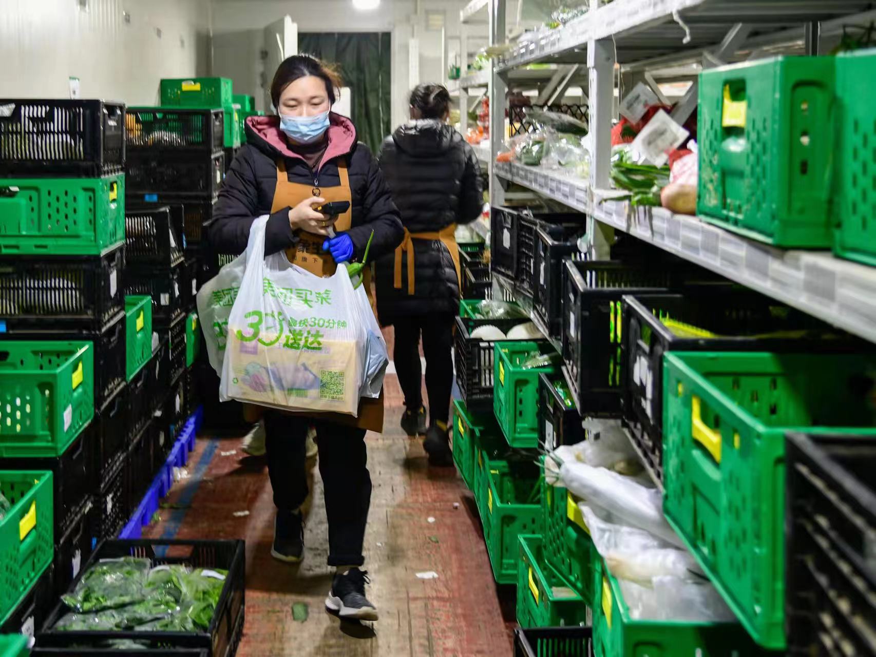 近日,劳动报记者驱车赶往位于松江区鹤诸路上的美团买菜站点,现场目睹了前置仓内的一片灯火通明的繁忙景象。