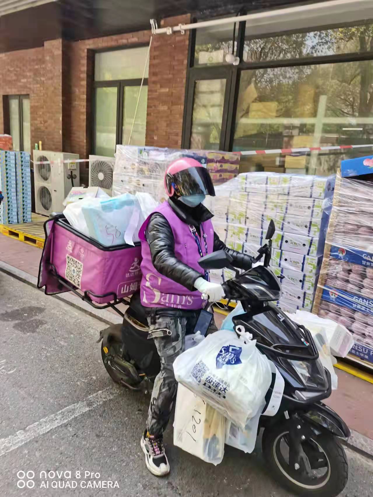 来自河南安阳的李志梅,就是此次来沪“出差”的骑手之一。3月23日听说需要外地骑手前往上海增援,她便第一时间自愿报了名,乘火车风尘仆仆到达上海后,自3月24日起便一直在上海浦东新区配送米面粮油、生鲜蔬菜等各类生活物资。