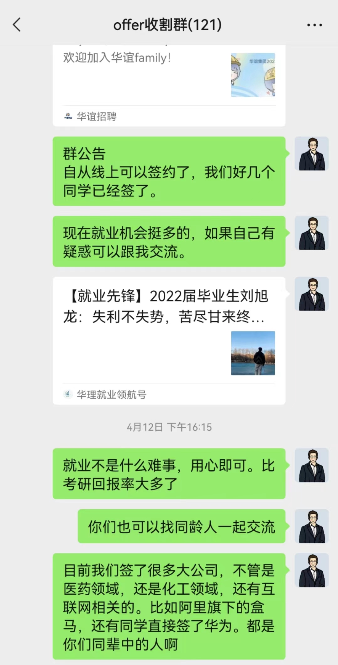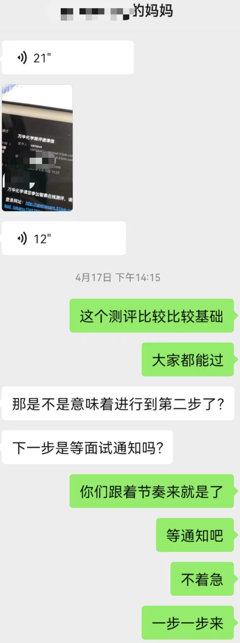 在详细了解了双方的就业期许后,顾益江向程同学推荐了万华化学等国企就业方向,学生和家长都豁然开朗。从学生投递简历,到参加线上测评和面试等各环节,他都会通过微信或电话的方式持续跟进,针对家长的疑问也会逐一作出解释。在几方的共同努力之下,程同学最终收到了万华化学的录用通知,家长第一时间跟顾益江电话分享了这份喜悦。